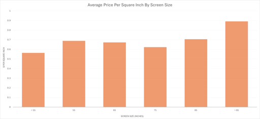 - For most popular high end models, the 65 inch models are cheapest / sq inch (e.g Sony A95L, Samsung S90D, LG G4). For most others, it’s the 75 inch models.
