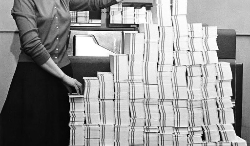 The image of 62,500 punched cards neatly stacked in rows serves as a reminder of the immense physicality involved in early computing.