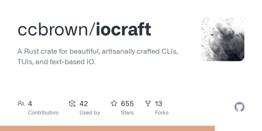 arrow-up137arrow-down1external-linkiocraft: A crate for beautiful, artisanally crafted CLIs, TUIs, and text-based IO using React-like componentsgithub.comcm0002@lemmy.world to Rust@programming.dev · 7 months agomessage-square1linkfedilinkcross-posted to: rust@lemmy.ml