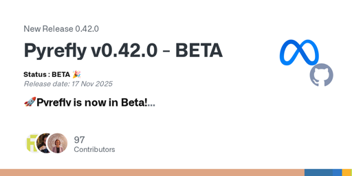 Status : BETA 🎉 Release date: 17 Nov 2025 🚀Pyrefly is now in Beta! We’re thrilled to announce with this release that Pyrefly has transitioned from Alpha to Beta status! This marks a new chapter for...