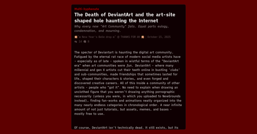 Michael_Washboard@lemmy.blahaj.zone to Technology@lemmy.worldEnglish · 15 days agoThe Death of DeviantArt and the art-site shaped hole haunting the Internet -- Multi-hyphenatetorrent-empress.leaflet.pubexternal-linkmessage-square27linkfedilinkarrow-up1172arrow-down12