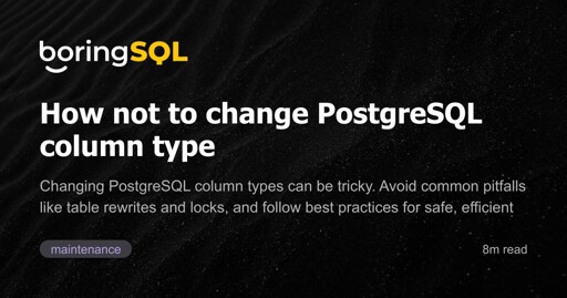 Jason Novinger@programming.devM to PostgreSQL@programming.dev · 1 year agoHow not to change PostgreSQL column type | boringSQLnotso.boringsql.comexternal-linkmessage-square0linkfedilinkarrow-up14arrow-down11file-text