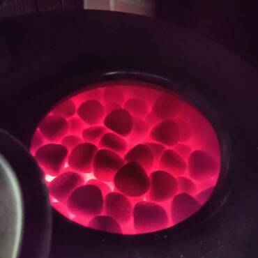 Lagerfeuer, ausgewählte* Steine rein, bis sie glühen, dann ein “Zelt” aus Weidenruten und Decken, mit einer Grube in dr Mitte, wo die glühenden Steine reinkommen => Schwitzhütte, Nordamerikanische Art.
