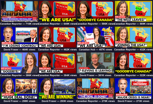 arrow-up1666arrow-down1external-linkSlopaganda: Coordinated network of inauthentic YouTube channels are pushing secession to Canadians at Alberta and even U.S. annexation.plus-squarewww.cdmrn.caDeep@mander.xyz to Technology@lemmy.worldEnglish · 5 days agomessage-square101linkfedilink